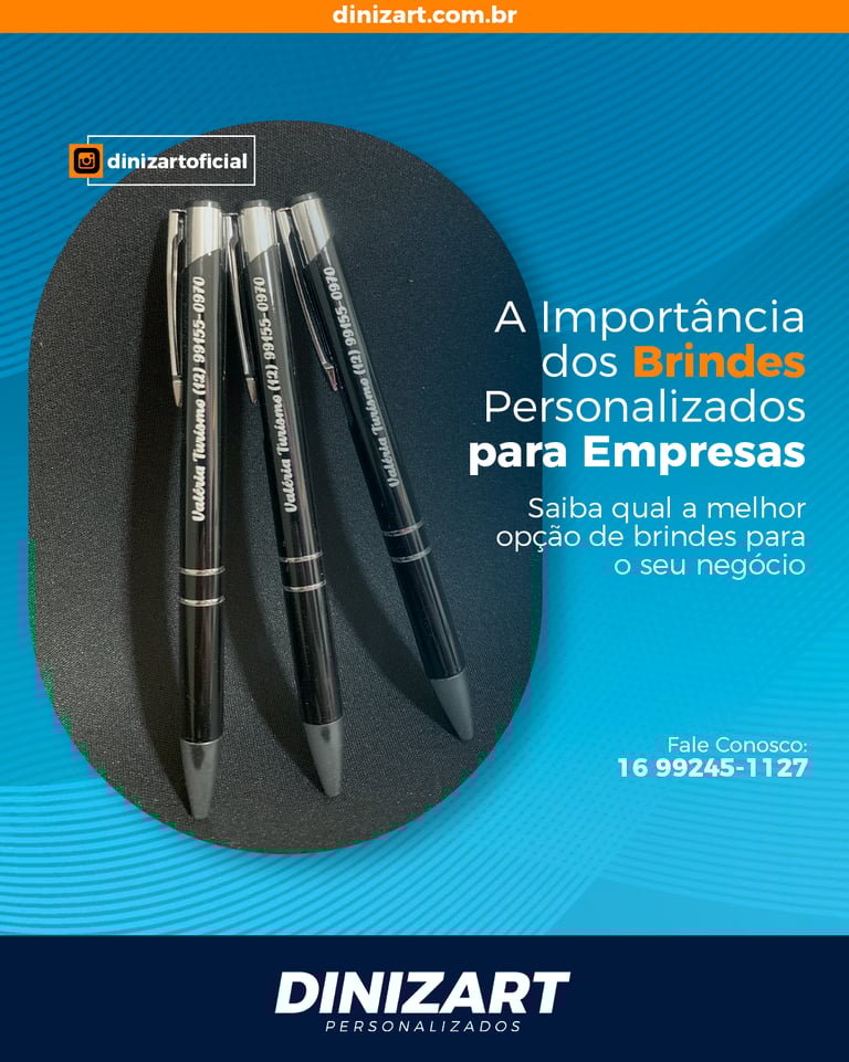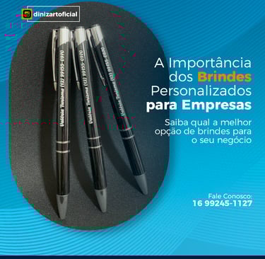 No ambiente corporativo, fortalecer a marca e estreitar relacionamentos com clientes e colaboradores é essencial. Os brindes personalizados são uma excelente estratégia para alcançar esse objetivo, pois transmitem cuidado, atenção aos detalhes e posicionamento profissional. Muito mais que um presente, são ferramentas de conexão. A DinizART Personalizados oferece opções criativas e exclusivas, como canivetes, chaveiros, cantis e vários outros produtos personalizados com gravação a laser. Cada item é produzido com alto padrão de qualidade e pensado para representar sua empresa com estilo e originalidade. Um brinde personalizado tem o poder de fazer sua marca ser lembrada todos os dias. Quer levar sua marca para outro nível? Fale com a DinizART no WhatsApp (16) 99197-1685 ou acesse www.dinizart.com.br e solicite um orçamento. Enviamos para todo o Brasil com agilidade e atendimento personalizado!