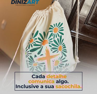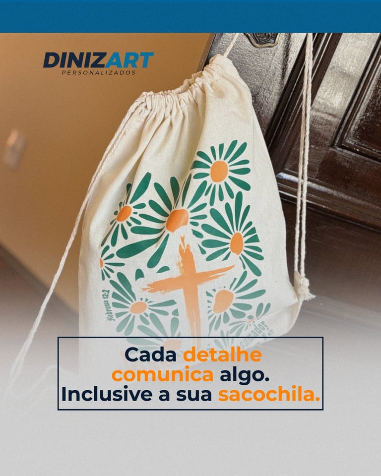 Cada detalhe comunica algo, e as sacochilas personalizadas da Dinizart são prova disso. Mais do que um acessório, elas são uma extensão daquilo que você acredita, representa ou deseja transmitir. Com personalização exclusiva, você pode transformar uma sacochila simples em um item cheio de identidade, capaz de comunicar sua mensagem, propósito ou marca com criatividade e estilo. Ideais para eventos, projetos, ações promocionais, encontros cristãos ou distribuição em grupos e equipes, nossas sacochilas são leves, resistentes e versáteis. Cabem no dia a dia de qualquer pessoa e marcam presença por onde passam. Seja com versículos, artes autorais, logotipos ou frases marcantes, tudo é feito com cuidado e qualidade. Quer comunicar algo que as pessoas levem nas costas — e no coração? Fale com a Dinizart pelo WhatsApp (16) 99245-1127 ou acesse www.dinizart.com.br e transforme sua sacochila em algo memorável e cheio de significado.