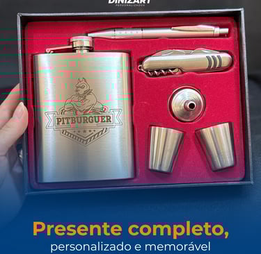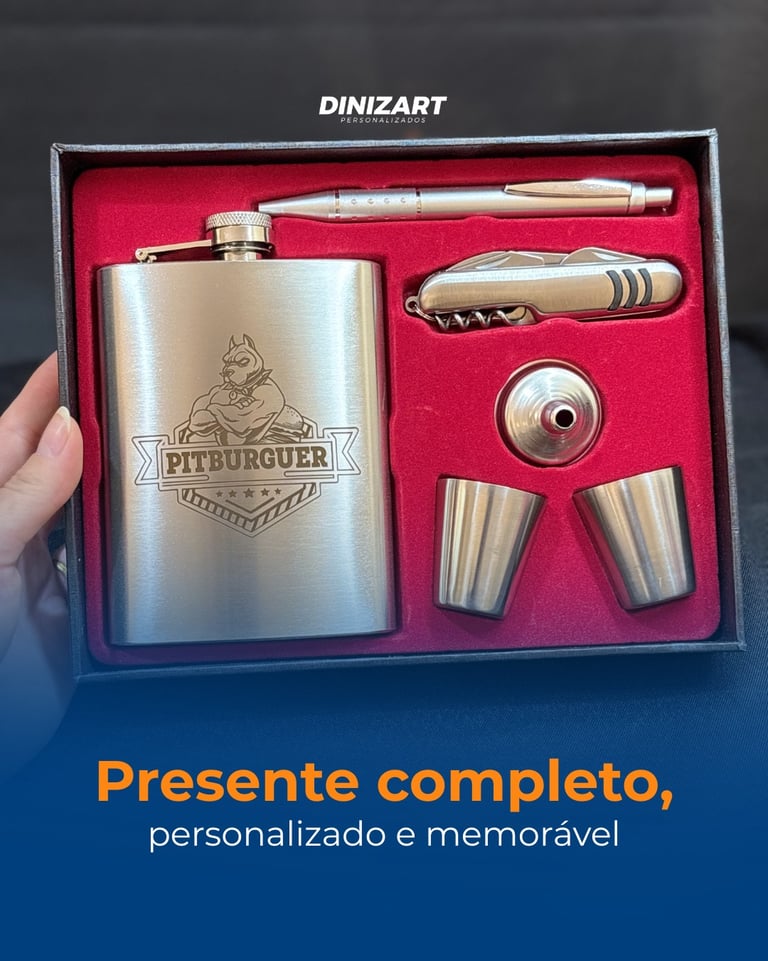 Se destacar na hora de presentear é uma arte e a Dinizart domina essa experiência com kits personalizados que impressionam pela elegância e funcionalidade. O modelo da imagem é um verdadeiro exemplo: um kit completo com cantil em inox, caneta, abridor multifuncional, funil e dois copos, todos acomodados em uma caixa com acabamento sofisticado. Cada item pode ser gravado com logotipo, nome ou arte personalizada, como esse kit feito para a marca "Pitburguer", mostrando que é possível aliar identidade visual à utilidade real. Ideal para presentear parceiros, clientes especiais, padrinhos ou equipes com bom gosto e originalidade. Faça sua marca ser lembrada de um jeito marcante. Personalize seu kit com a Dinizart pelo WhatsApp (16) 99245-1127 ou acesse www.dinizart.com.br e transforme um brinde em uma experiência inesquecível.